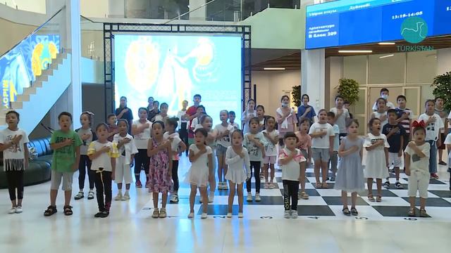 4 ші маусым Рәміздер күніне орай Оқушылар сарайының оқушылары Ән ұран шырқауда.