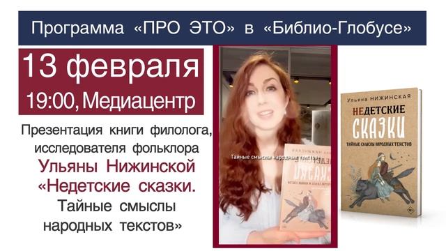 Презентация книги Ульяны Нижинской «Недетские сказки. Тайные смыслы народных текстов» (18+) пройдет 13 февраля в 19.00. Регистрация на мероприятие по ссылке: https://www.biblio-globus.ru/mediacenter/event/546 --- «Библио-Глобус» – старейший книжный магазин в самом центре Москвы и один из крупнейших в Европе. У нас вы можете найти книгу на любой вкус из 200 тысяч наименований. Мы предлагаем широкий выбор изданий на более чем тридцати иностранных языках. Ежедневно мы проводим встречи с известными авторами, актерами и спортсменами, организуем музыкальные квартирники и детские мероприятия, предоставляем площадку для театральных постановок и много другого. Все права на настоящие аудио-, видеоматериалы защищены и охраняются законом. Использование материалов без согласия ООО Торговый Дом «БИБЛИО-ГЛОБУС» не допускается. Наш сайт: http://www.biblio-globus.ru/ Мы в социальных сетях: VK: https://vk.com/biblioglobus_msk Telegram: https://t.me/biblioglobus_1 С любовью, Ваш "Библио-Глобус"