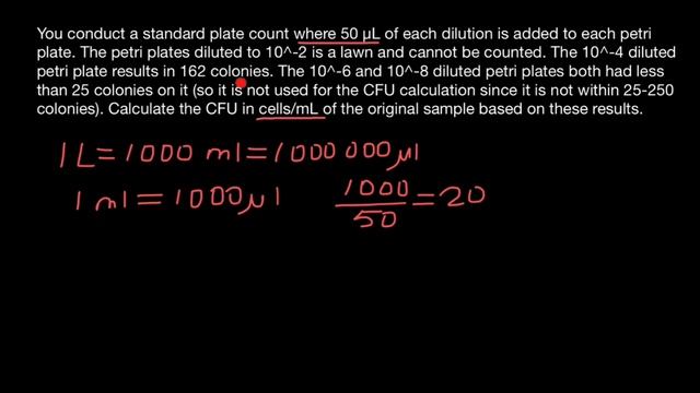 CFU (Colony-Forming Units) are used as a measurement in microbiology to estimate the number of viable microorganisms (such as bacteria or yeast) in a given sample. CFU is important for several reasons: Quantification of Microorganisms: CFU provides a quantitative measure of the number of viable microorganisms present in a sample. It helps researchers and scientists understand the population density and growth potential of microorganisms in various environments. Assessing Microbial Viability: CFU indicates the number of microorganisms capable of forming visible colonies on a specific growth medium under specific conditions. It allows researchers to distinguish viable cells from non-viable or dormant ones, providing insights into the metabolic activity and vitality of microbial populations. Quality Control in Industrial Processes: CFU is used in industries such as food production, pharmaceuticals, and water treatment to assess the microbial quality and safety of products. By determining CFU counts, companies can monitor and ensure compliance with regulatory standards, identify potential contamination issues, and implement necessary measures to maintain product quality. Antimicrobial Efficacy Testing: CFU is employed in evaluating the effectiveness of antimicrobial agents, such as antibiotics or disinfectants. By exposing microorganisms to these agents and measuring the reduction in CFU counts, researchers can assess the ability of the antimicrobial treatment to inhibit or eliminate microbial growth. Environmental Monitoring: CFU counts are valuable for environmental monitoring, such as assessing microbial contamination in air, water, soil, or surfaces. By measuring CFU levels, scientists can identify potential sources of contamination, track changes over time, and develop strategies for mitigating environmental risks. Microbial Research and Studies: CFU counts serve as a fundamental metric in microbiological research, enabling scientists to investigate microbial growth patterns, study factors influencing microbial survival and proliferation, evaluate the impact of environmental conditions on microbial communities, and develop strategies for disease control or biotechnological applications. Problem: You conduct a standard plate count where 50 μL of each dilution is added to each petri plate. The petri plates diluted to 10-2 is a lawn and cannot be counted. The 10-4 diluted petri plate results in 162 colonies. The 10-6 and 10-8 diluted petri plates both had less than 25 colonies on it (so it is not used for the CFU calculation since it is not within 25-250 colonies). Calculate the CFU in cells/mL of the original sample based on these results. Solution # of colonies counted = 162 amount of diluted sample added to the petri plate in mL = 50 μL = 0.05 mL dilution of the petri plate counted = 10-4 Step 1: Determine the concentration of cells in the diluted sample: (# of colonies counted on the petri plate) ÷ (amount of diluted sample added to the petri plate in mL) = CFU in diluted sample (cells/mL) (162 colonies) ÷ (0.05 mL diluted sample added to petri plate) = 3,240 cells/mL in the diluted sample Step 2: Determine the concentration of cells in the original sample: (CFU in diluted sample) ÷ (dilution of the petri plate counted) = CFU in original sample (cells/mL) (3,240 cells/mL in diluted sample) ÷ (10-4 dilution of the petri plate counted) = 32,400,000 cells/mL in original sample or 3.24 x 107 cells/mL in original sample CFU = 32,400,000 cells/mL in original sample or 3.24 x 107 cells/mL in original sample https://www.youtube.com/watch?v=uuc9QbfMNus