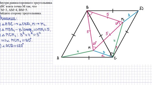 Внутри равностороннего треугольника АВС взята тоска М так, что МС=3, МА=4, МВ=5. Найдите сторону треугольника.