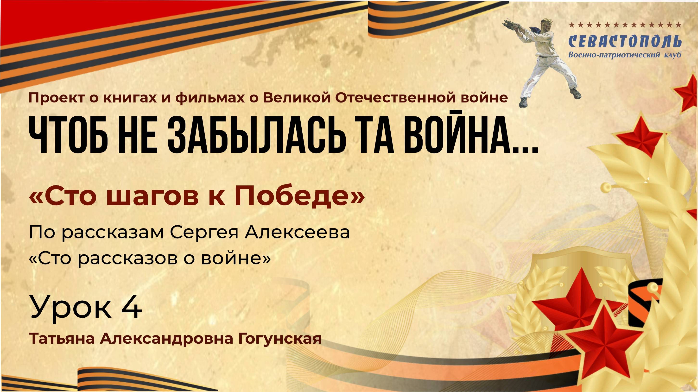 Программа патриотического воспитания «Чтоб не забылась та война» Лекция по теме: "Сто шагов к Победе". По рассказам С. Алексеева "Сто рассказов о войне" Гогунская Татьяна Александровна, кандидат исторических наук, заведующий кафедрой основ российской государственности, заместитель проректора по учебно-методической деятельности ФГАОУ ВО "Крымский федеральный университет им. В.И. Вернадского", г. Симферополь