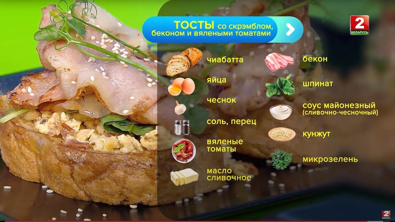 Тосты со скрэмблом, беконом и вялеными томатами! Сергей Петроченко - шеф-повар! Instagram «Включайся!»: https://www.instagram.com/vkluchaysia/ Instagram Беларусь 2: https://www.instagram.com/belarus2tv/