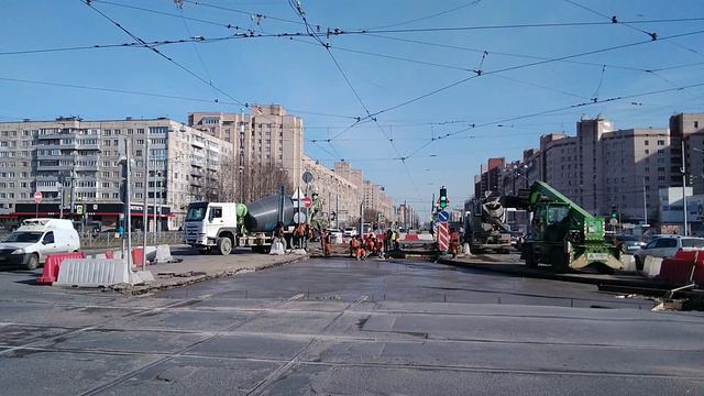 На углу проспекта Проспекта Культуры и Просвещения сайчас активно ведётся ремонт трамвайных путей. Правда, я снял, ккогда половина работ уже прошла. Сейчас идёт процесс заливки арматуры бетоном. Я как раз его заснял и выравнивание. Потом на ней будут рельсы.