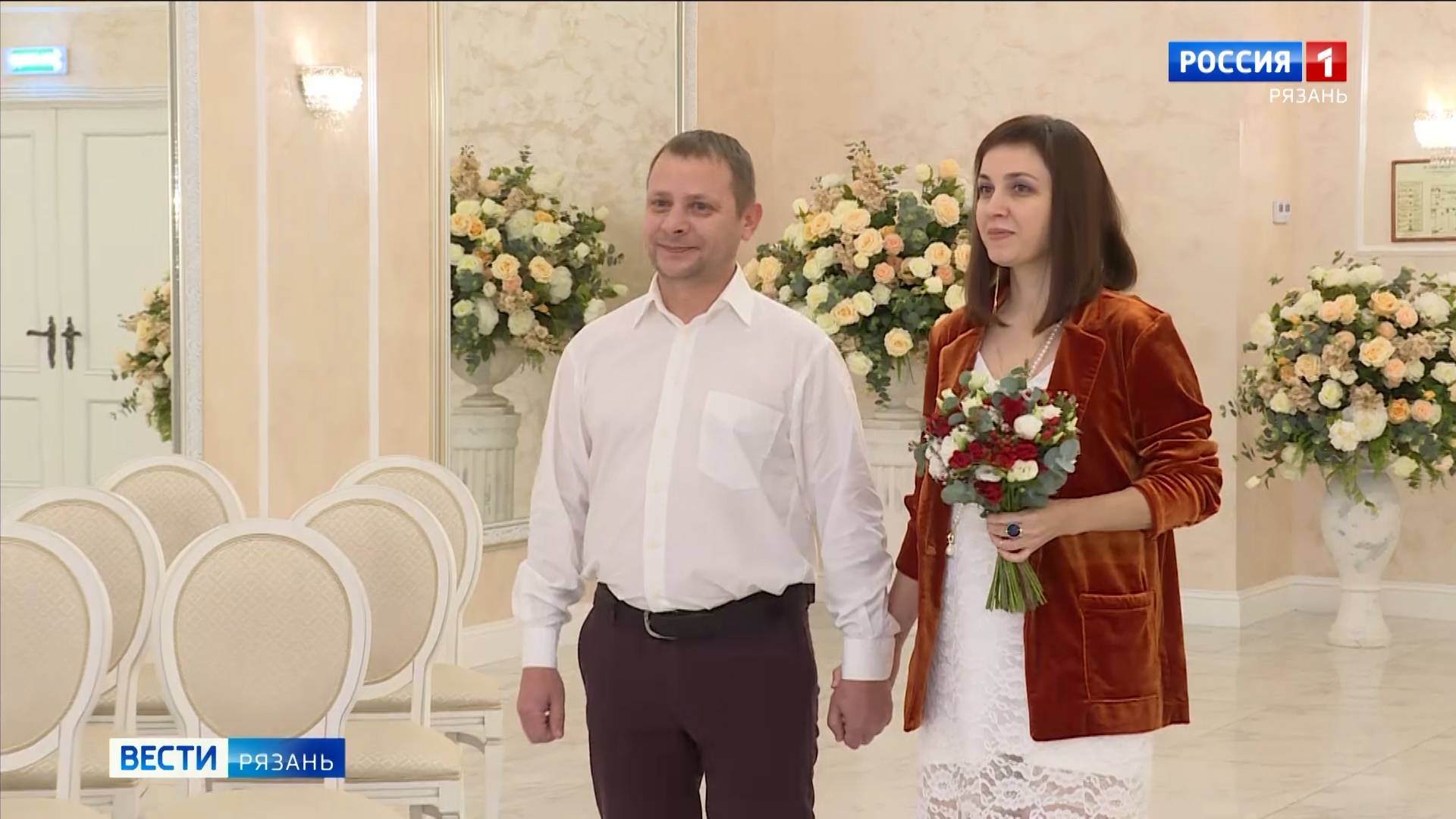 Супруги Захаровы отметили юбилей семейной жизни походом в ЗАГС. Там для них устроили целую церемонию, на которой снова звучал марш Мендельсона, и ожили те самые свадебные воспоминания - согласие, роспись, кольца, поцелуй.