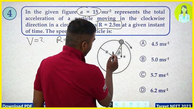 In the given figure a = 15 ms-2 represents the total acceleration of a particle moving in the clockwise direction in a circle of radius R = 2.5m at a given instant of time. The speed of the particle is: Ⓐ 4.5 ms-1 Ⓑ 5.0 ms-1 Ⓒ 5.7 ms-1 Ⓓ 6.2 ms-1 #madhursinghphysics