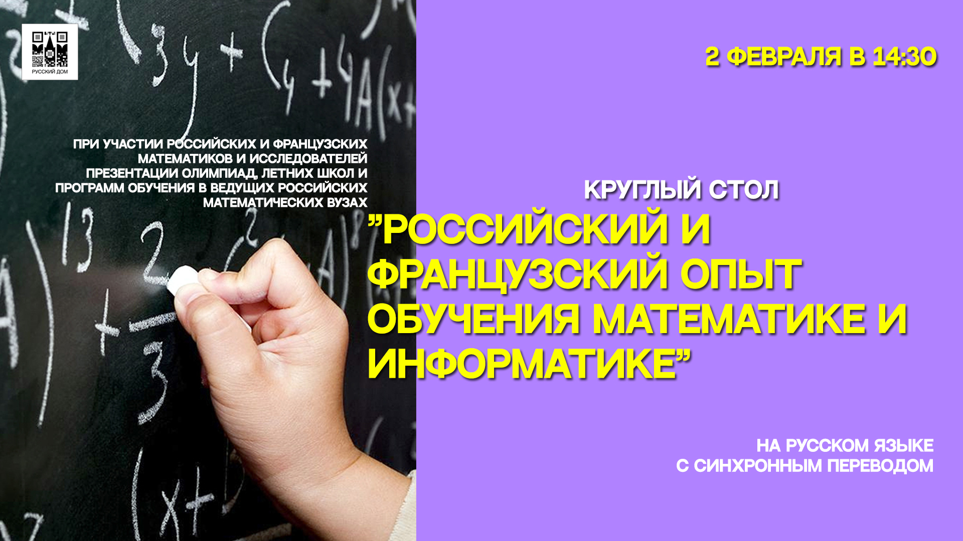 2 февраля на онлайн-площадке Русского дома науки и культуры в Париже состоялся круглый стол, посвященный российскому и французскому опыту обучения математике и информатике. Наиболее востребованной темой для французских лицеистов и соотечественников, проживающих во Франции, является довузовская подготовка, онлайн-школы при ведущих российских вузах, возможность участия в математических олимпиадах.