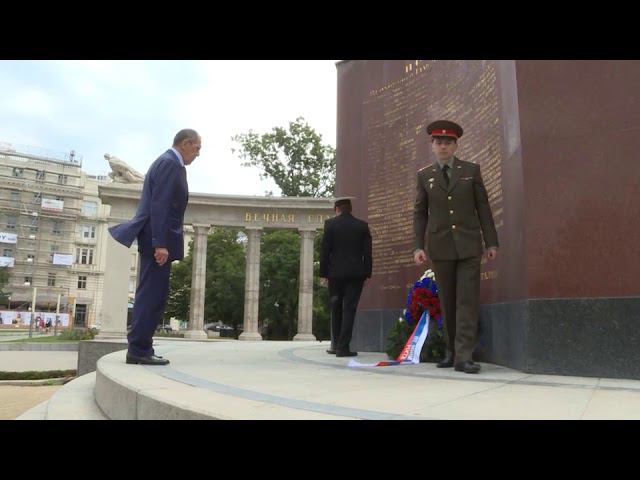 Возложение венка Министром иностранных дел России С.В.Лавровым к памятнику в честь советских воинов, погибших при освобождении Вены, Вена, 6 июля 2018 года