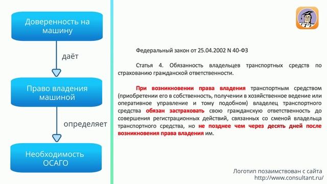 В России после возникновения права владения автомобилем возможно 10 дней управлять автомобилем без полиса ОСАГО. Закон предусматривает такую возможность, чтобы водитель смог съездить в страховую компанию, пункт технического осмотра, ГИБДД. В видео подробное правовое разъяснение возможности управлять ТС без ОСАГО 10 дней. Позицию Верховного Суда по данному вопросу: https://auto-delivery.ru/documents/osago Auto-Delivery подготовила страховые решения для клиентов с закрытым (ограниченным) полисом ОСАГО, поэтому нашему водителю не придется доставлять ваш автомобиль в автосервис без полиса ОСАГО. Подробнее: https://auto-delivery.ru/#insurance или задайте все вопросы по телефону: 8 (499) 840-97-97. ___ Услуги Auto-Delivery ? Водитель отвезёт Ваш автомобиль в Ваш любимый автотехцентр, шинный сервис, мойку. Предварительная запись, договор, чек или счёт для юридического лица, видеоконтроль. Полная информация о компании: https://auto-delivery.ru/ Контакты для оформления заказа: 8 (499) 840-97-97 info@auto-delivery.ru https://auto-delivery.ru/contacts #осаго #безосаго #ездабезосаго #страховка #водитель #автосервис #шиномонтаж #автомойка #доставкаавто