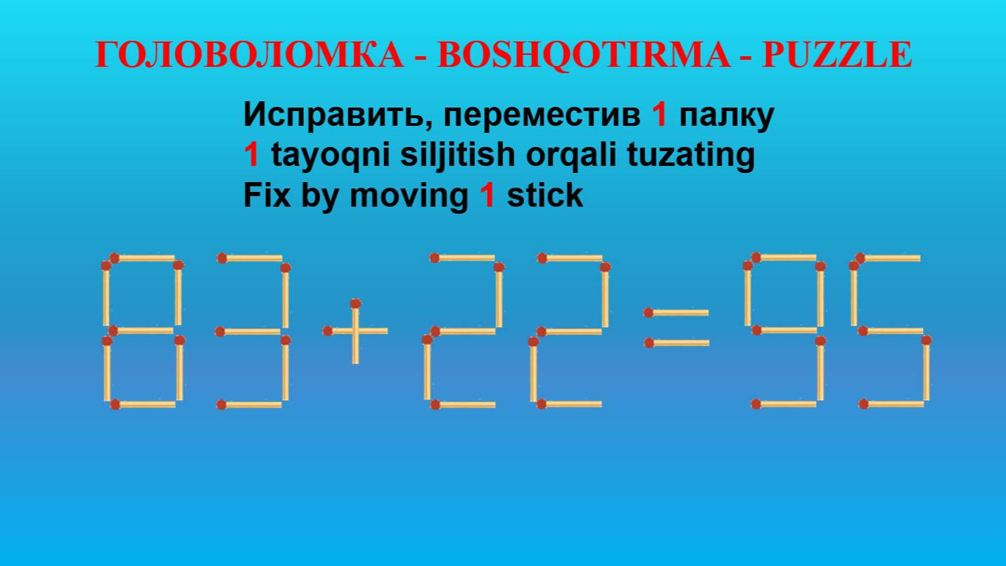 ГОЛОВОЛОМКА - BOSHQOTIRMA – PUZZLE. Спичка. 90+25=63, 95-32=33, 83+22=95, 59-28=90