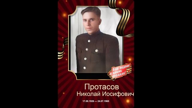 Это мой родной дядя - Протасов Николай Иосифович! Настоящий Герой! Очень горжусь им! - в 1943 году пошел добровольцем в 17 лет на фронт - Орден Красной Звезды - Орден Славы III степени - Медаль за Отвагу - Медаль за Победу над Германией Сухопутные войска 123 стрелковый полк 62 стрелковой дивизии (III) Был дважды ранен, окончил войну в Прибалтике в 1945 году! Нижайший поклон всем войнам , труженикам тыла Советского Союза за этот ВЕЛИКИЙ ПОДВИГ НАРОДОВ СССР, особенно РУССКОГО НАРОДА! Будем помнить, передавать из поколения в поколения пока существует Человечество! Иначе нацизм будет всегда воскрешаться, даже в тех странах, как Украина, в которой он в априори был не возможен! С ДНЕМ ПОБЕДЫ УРААААААААААААААААААААА!