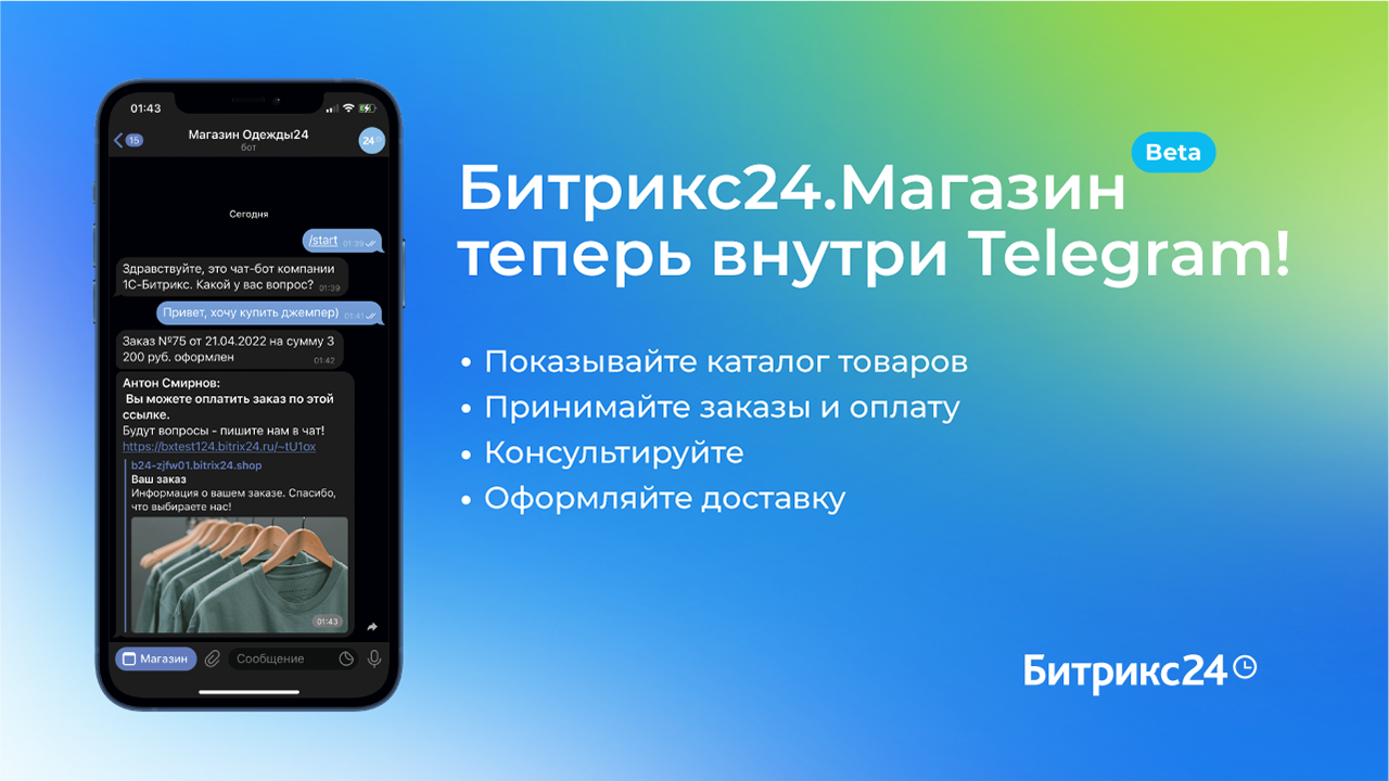 Битрикс24 теперь поддерживает продажи внутри Telegram! 16 апреля Telegram разрешил создавать собственные интерфейсы для ботов. Мы не смогли пройти мимо и уже выпустили интеграцию с интернет-магазинами Битрикс24! Вот как это работает: https://vc.ru/services/407768-bitriks24-teper-podderz.. Теперь менеджеру не нужно постоянно переходить из CRM в мессенджер и копипастить ссылки. А покупатель может пройти весь путь покупки не выходя из Telegram. Ну круто же! P.S. Пока интеграция доступна в статусе beta. Подробнее об интеграции: https://helpdesk.bitrix24.ru/open/15718474 ? Читайте нас ВКонтакте: https://vk.com/bitrix24 ? В Яндекс.Дзен: https://bit.ly/3qptJWg ? И в Одноклассники: https://bit.ly/3ukPB6a ? Получайте инсайты в Telegram-канале: https://t.me/bitrix_news ? И в Tenchat: https://bit.ly/3NdFgSk ? Смотрите нас в ТикТок: https://bit.ly/309WtrF