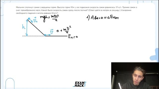 Мальчик столкнул санки с вершины горки. Высота горки 10 м, у ее подножия скорость санок - №22928
