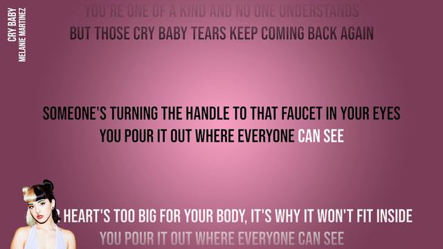 Sing along to the official karaoke instrumental of Melanie Martinez's Cry Baby. Subscribe https://bit.ly/2YYdl0s & click 🔔 - new videos every week! Listen to Melanie Martinez’s original performance of Cry Baby for tips https://youtu.be/O87lzhoexyA More Melanie Martinez SongJam Karaoke https://www.youtube.com/playlist?list=PLOWtYaZUh-IhpswOI490XER5pwhtsSa6a More Melanie Martinez K-12 Full Album Karaoke https://www.youtube.com/playlist?list=PLOWtYaZUh-IiJnjNfUgOVikrODAvFLBGC More Best of 10s 🎈 SongJam Karaoke https://www.youtube.com/playlist?list=PLOWtYaZUh-IjEv5ysX1pwMTJ1oxTKPoA1 Lyrics You seem to replace your brain with your heart You take things so hard and then you fall apart You try to explain, but before you can start Those cry baby tears come out of the dark Someone's turning the handle to that faucet in your eyes You pour it out where everyone can see Your heart's too big for your body, it's why it won't fit inside You pour it out where everyone can see They call you cry baby, cry baby But you don't ****** care Cry baby, cry baby So you laugh through your tears Cry baby, cry baby Cause you don't ****** care Tears fall to the ground You'll just let them drown You'll just let them drown Cry baby, cry baby You're all on your own and you lost all your friends You told yourself that it's not you, it's them You're one of a kind and no one understands But those cry baby tears keep coming back again Someone's turning the handle to that faucet in your eyes You pour it out where everyone can see Your heart's too big for your body, it's why it won't fit inside You pour it out where everyone can see They call you cry baby, cry baby But you don't ****** care Cry baby, cry baby So you laugh through your tears Cry baby, cry baby Cause you don't ****** care Tears fall to the ground You'll just let them drown Cry baby, cry baby You'll just let them drown Cry baby, cry baby You'll just let them drown I look at you and I see myself I know you better than anyone else I have the same faucet in my eyes So your tears are mine They call me cry baby, cry baby But I don't ****** care Cry baby, cry baby I laugh through my tears Cry baby, cry baby Cause I don't ****** care Tears fall to the ground I just let them drown Cry baby, cry baby I just let them drown Cry baby, cry baby You'll just let them drown They call you cry baby, cry baby I just let them drown Cry baby, cry baby You'll just let them drown Sing along to your favourite songs with SongJam, the home of 'Official Karaoke'. Featuring studio recordings by Dua Lipa, Stormzy, Melanie Martinez, Gorillaz, Ashnikko and many more. Find the latest releases right here plus much-loved hits from the 60s right up to 2020! Discover if you’re a pop bopper, rock royalty or hip-hop hero. New videos published every week. Subscribe to SongJam to be the first to know when new videos are published! Follow SongJam https://www.youtube.com/c/songjam?sub_confirmation=1 http://www.songjam.co Follow Melanie Martinez https://www.youtube.com/channel/UC2YnEq5Fc5_zEO6bo0oNzCQ http://melaniemartinezmusic.com https://instagram.com/littlebodybigheart https://twitter.com/melanielbbh https://www.facebook.com/melaniemartinezmusic #SongJamKaraoke #OfficialKaraoke #MelanieMartinez #Karaoke #SongJam