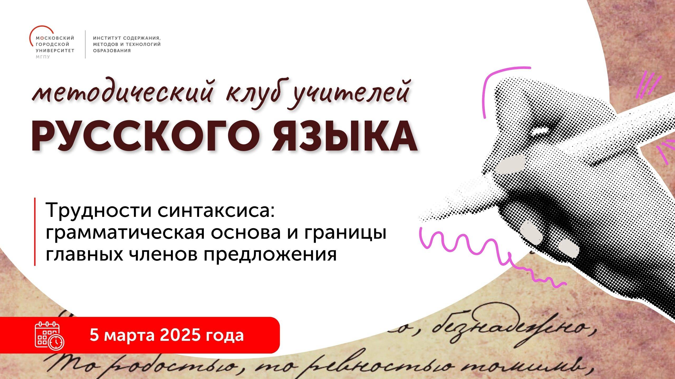 "Приглашаем учителей русского языка на очередное заседание Методического клуба учителей русского языка. Встреча будет посвящена трудностям синтаксиса, связанным со сложными случаями выделения грамматической основы предложения и определением границ главных членов. В заседании примут участие эксперт ИСМиТО, доктор филол. н., профессор ИРЯ им. А. С. Пушкина Акимова Э. Н., к. филол. н., учитель школы № 1553 им. В. И. Вернадского, младший научный сотрудник МГУ им. М. В. Ломоносова Ковригина Е. А.