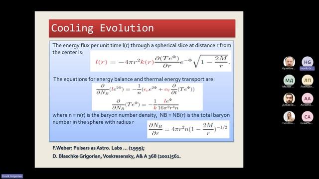 https://events.rudn.ru/event/240/ Моделирование эволюции охлаждения нейтронных звезд Овик Александрович Григорян Лаборатория информационных технологий им. М. Г. Мещерякова, Объединенный институт ядерных исследований, Дубна, Россия Отдел вычислительной физики и ИТ, Национальная научная лаборатория им. А. И. Алиханяна (ЕрФИ), Ереван, Армения Нейтронные звезды как релятивистские объекты описываются уравнениями общей теории относительности. Поэтому для моделирования их тепловой эволюции необходимо использовать уравнение состояния сверхплотной ядерной материи и её состава, а также модификации уравнения теплопереноса на случай релятивизма. Основными факторами охлаждения нейтронных звезд являются излучение нейтрино в ходе равновесных бета-процессов в горячей звездной среде: адронной материи во внутренней оболочке и возможной кварковой материи в ядре звезды. Особую роль в эволюции охлаждения играет сверхпроводящее состояние звездного вещества при высоких плотностях. Также важным аспектом является умение определять наборы параметров моделей, при которых моделирование температуры поверхности звезд будет удовлетворять известным современным данным наблюдений по температуре и возрасту десятков объектов. Нами был создан пакет программ, моделирующий эволюцию остывания нейтронных звезд для различных моделей ядерной материи с учетом модификаций средовых механизмов излучения нейтрино, сверхпроводящего состояния и свойств коры. Учтена возможность существования гиперонов, кварков, звезд-близнецов и темной материи внутри звезды. В программе также реализованы алгоритмы параллельных вычислений. Предложен метод извлечения модельно-зависимых вероятностей возможных значений масс наблюдаемых объектов на основе результатов эволюции охлаждения. Эти результаты можно использовать для валидации моделей ядерной материи в экстремальных условиях. Modeling the evolution of cooling of neutron stars Hovik Grigorian Meshcheryakov Laboratory of Information Technologies, Joint Institute for Nuclear Research, Dubna, Russia Division of Computational Physics and IT, Alikhanyan National Science Laboratory (YerPhI), Yerevan, Armenia Neutron stars, as relativistic objects, are described by the equations of general relativity. Therefore, for modeling their thermal evolution, it is necessary to use the equation of state of superdense nuclear matter and its composition, as well as modifications of the heat transfer equation for relativistic cases. The primary cooling factors of neutron stars are neutrino emissions during equilibrium beta processes in the hot stellar environment: in the hadronic matter of the inner shell and the possible quark matter in the star's core. An essential role in the cooling evolution is played by the superconducting state of stellar matter at such high densities. Another important aspect is the ability to determine sets of model parameters under which the surface temperature modeling of stars will satisfy known contemporary observational data on the temperature and age of tens of objects. We have developed a software package that models the cooling evolution of neutron stars for various models of nuclear matter, taking into account modifications of neutrino emission mechanisms, superconducting states, and crust properties. The program accounts for the possibility of hyperons, quarks, twin stars and dark matter existing within the star. Parallel computing algorithms are also implemented in the software. A method is proposed for extracting model-dependent probabilities of possible values of the masses of observed objects based on the results of the cooling evolution. All these results can be used to validate nuclear matter models under extreme conditions.