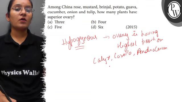 Among China rose, mustard, brinjal, potato, guava, cucumber, onion and tulip, how many plants have superior ovary? (a) Three (b) Four (c) Five (d) Six (2015) 📲PW App Link - https://bit.ly/PW_APP 🌐PW Website - https://bit.ly/PW_APP 📌 PHYSICS WALLAH OTHER CHANNELS : 🌐 PhysicsWallah -Alakh Pandey: https://youtube.com/@PhysicsWallah 🌐 Alakh Pandey: https://youtube.com/@alakhpandey1414 🌐 JEE Wallah: https://youtube.com/@jee_wallah 🌐 Competition Wallah: https://youtube.com/@competitionwallah 🌐 PW Foundation: https://youtube.com/c/PhysicsWallahFoundation 🌐 NCERT Wallah : https://www.youtube.com/channel/UC8zCnnfhz-dvIpVdZ1CheuA 🌐 Defence Wallah-NDA: https://youtube.com/channel/UC8OCoGX9tmMneOzIFUTWq2Q 🌐 PhysicsWallah English: https://youtube.com/@EnglishPW 🌐 PW Vidyapeeth: https://youtube.com/@VidyapeethPW 🌐 Commerce Wallah by PW: https://youtube.com/@commercewallahpw 🌐 CA Wallah bt PW: https://www.youtube.com/channel/UC2amkJX5zDyQJ0mDajAWRSA 🌐 PW Sarkari Exam: https://youtube.com/@PWSarkariExams 🌐 PW - Hindi Medium: https://youtube.com/@physicswallahhindimedium 🌐 PW Bangla: https://youtube.com/@pwbangla 🌐 PW Maharashtra: https://youtube.com/@PWMaharashtra 🌐 PW Telugu: https://youtube.com/@PWTelugu 🌐 PW Kannada: https://youtube.com/@PWKannada 🌐 PW Gujarati: https://youtube.com/@PWGujarati 🌐 PW Facts: https://youtube.com/@pwfacts 🌐 PW Insiders: https://youtube.com/channel/UCHMWQFr9Nwo3wJsAap2Wnfw 🌐 PW Little Champs: https://youtube.com/@pwlittlechamps 🌐 PW Pathshala: https://youtube.com/channel/UCcXUY9NSMyYbkOvUD97CUmA 🌐 Banking Wallah : https://www.youtube.com/channel/UCg5_K50hLTKerLkSE7I1yWQ 🌐 SSC Wallah : https://www.youtube.com/channel/UCcaEVV7A47J4k9GFcqOOYkg 🌐 JEE Challengers by PW : https://www.youtube.com/channel/UCyf71tWV2abeN-l_UKiJ-5g 🌐 UPSC Wallah : https://www.youtube.com/channel/UCqOy6oOu6RPJNHYQ8f_Ybvg 🌐 UPSC Wallah हिन्दी : https://www.youtube.com/channel/UCmrP-DYdZuThp8AO9lnnwNw 🌐 GATE Wallah : https://www.youtube.com/channel/UC9PoSJoftLvEnXT-PtQ5Wtw 🌐 GATE Wallah - EC,EE & CS : https://www.youtube.com/channel/UCuGWIkiNaWjsCqybgxGuxfg 🌐 GATE Wallah - ME, CE & XE : https://www.youtube.com/channel/UCGrrw9x3_B_fItUIBMvqAUw 🌐 GATE English : https://www.youtube.com/channel/UCOsV75fSUr8gnMbhx-Qh3Lg 🌐 College Wallah : https://www.youtube.com/channel/UCDrf0V4fcBr5FlCtKwvpfwA 🌐 PW IIT JAM & CSIR NET : https://www.youtube.com/channel/UCuj28Zll58sztDqLiDhzgtQ 🌐 MBA Wallah : https://www.youtube.com/channel/UCWWEvCschv0T0rtou4VaKGw 🌐 Teaching Wallah : https://www.youtube.com/channel/UCUzqJZOkCejFoc5eqWWA9Eg 📌 PHYSICS WALLAH SOCIAL MEDIA PROFILES : 🌐 Telegram : https://t.me/pwjeewallah 🌐 Facebook : https://www.facebook.com/physicswallah 🌐 Instagram : https://www.instagram.com/pwjee_wallah/?hl=en 🌐 Twitter : https://twitter.com/physics__wallah 🌐 Linkedin : https://www.linkedin.com/company/78087354/admin/ 📌 For any queries or complaints Visit : https://bit.ly/PW_Queries