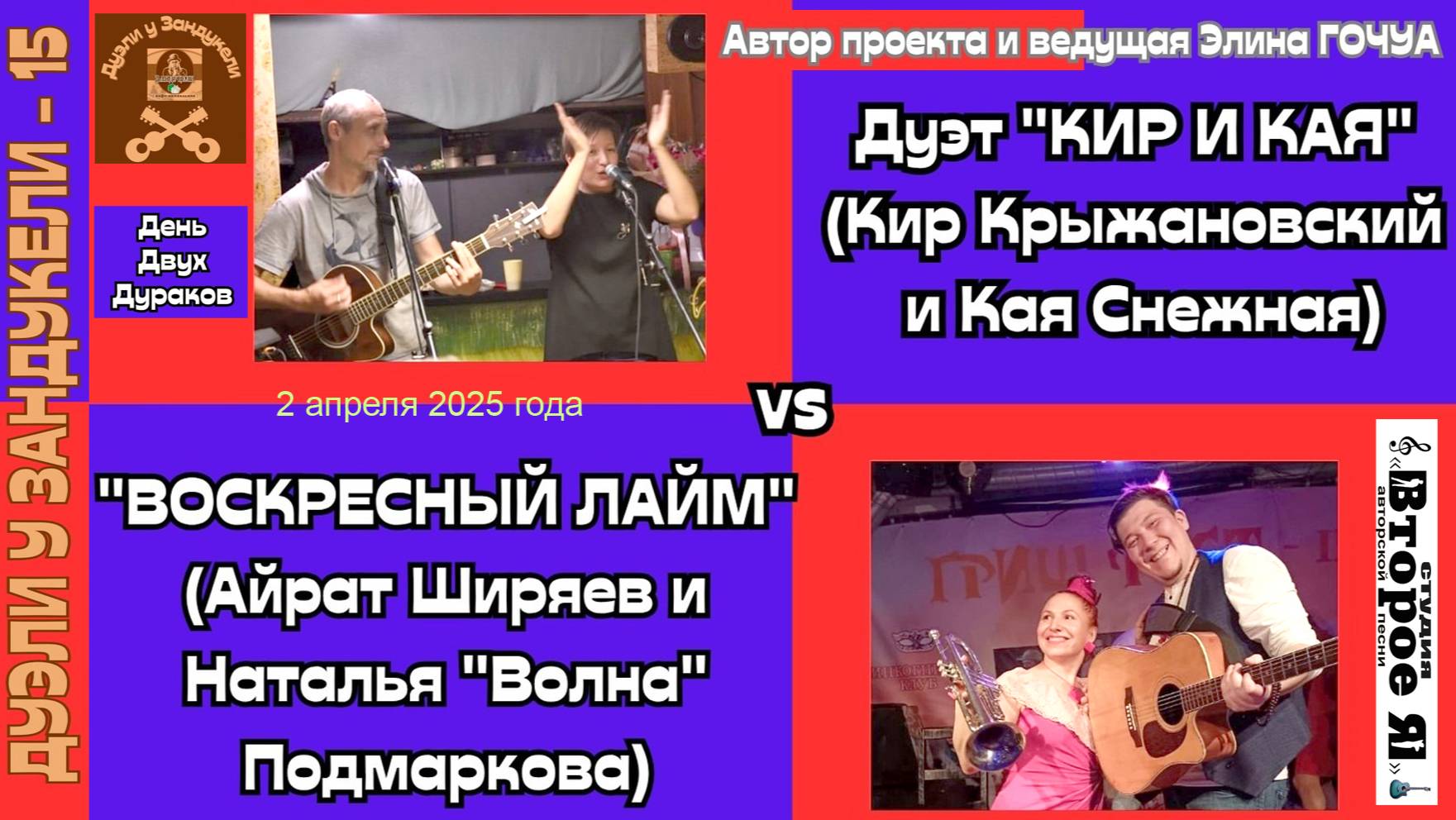 Участники: дуэт «Кир и Кая» (Кирилл Крыжановский и Кая Снежная), дуэт «Воскресный Лайм» (Айрат Ширяев и Наталья «Волна» Подмаркова). Секунданты: Ирина Курашёва, Альберт Гиндулин. Продолжительность – 2 часа 16 минут. Арт-кафе «Зандукели»: Москва, Оружейный переулок, дом 25, строение 1 (вход с улицы Фадеева), метро «Маяковская». 2 апреля 2025 года.