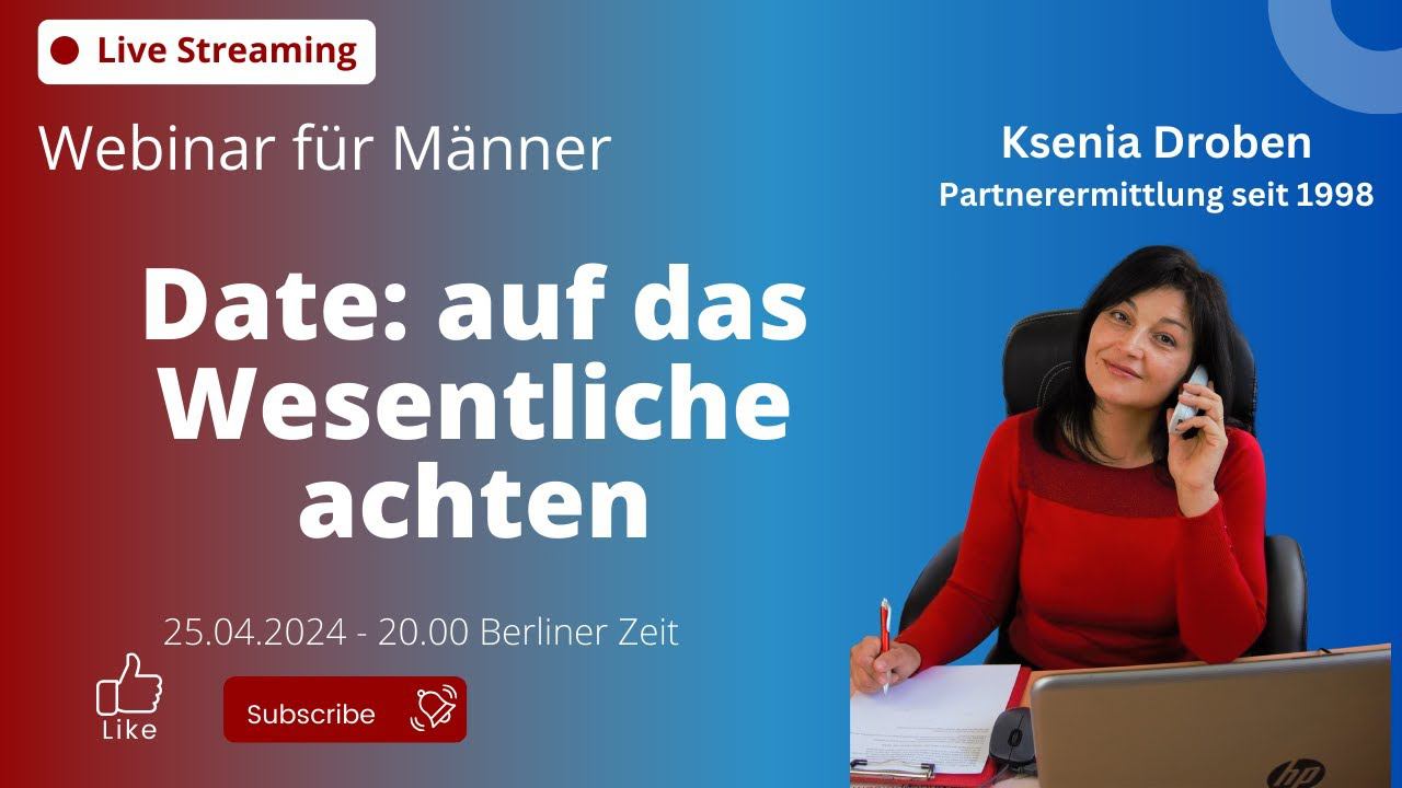 Liebe Herren, Heute treffen wir uns zum Webinar und ich gebe Ihnen Tipps und Empfehlungen, worauf Sie beim persönlichen Kennenlernen achten sollten. Viele von Ihnen sind so von der Schönheit und den Beinen abgelenkt, dass Sie nicht auf das Wesentliche achten. Und das führt zu großen Enttäuschungen, wenn die rosa-rote Brille weg ist. Unser Thema ist „Date: auf das Wesentliche achten“ Wann: Donnerstag, den 25.April um 20.00 Wo: YouTube Channel "Ksenia Droben": https://www.youtube.com/@KseniaDrobenPartnervermittlung Alternativ auch Facebook: https://www.facebook.com/ksenia.droben/ Twitch: https://www.twitch.tv/kseniadating LinkedIn: https://www.linkedin.com/in/ksenia-droben-911289148/ Instagram @kseniadroben.agency Tiktok: @kseniamatchmaking Dauer: Ca. 60 Minuten Ich freue mich sehr auf Ihre Fragen und Kommentare