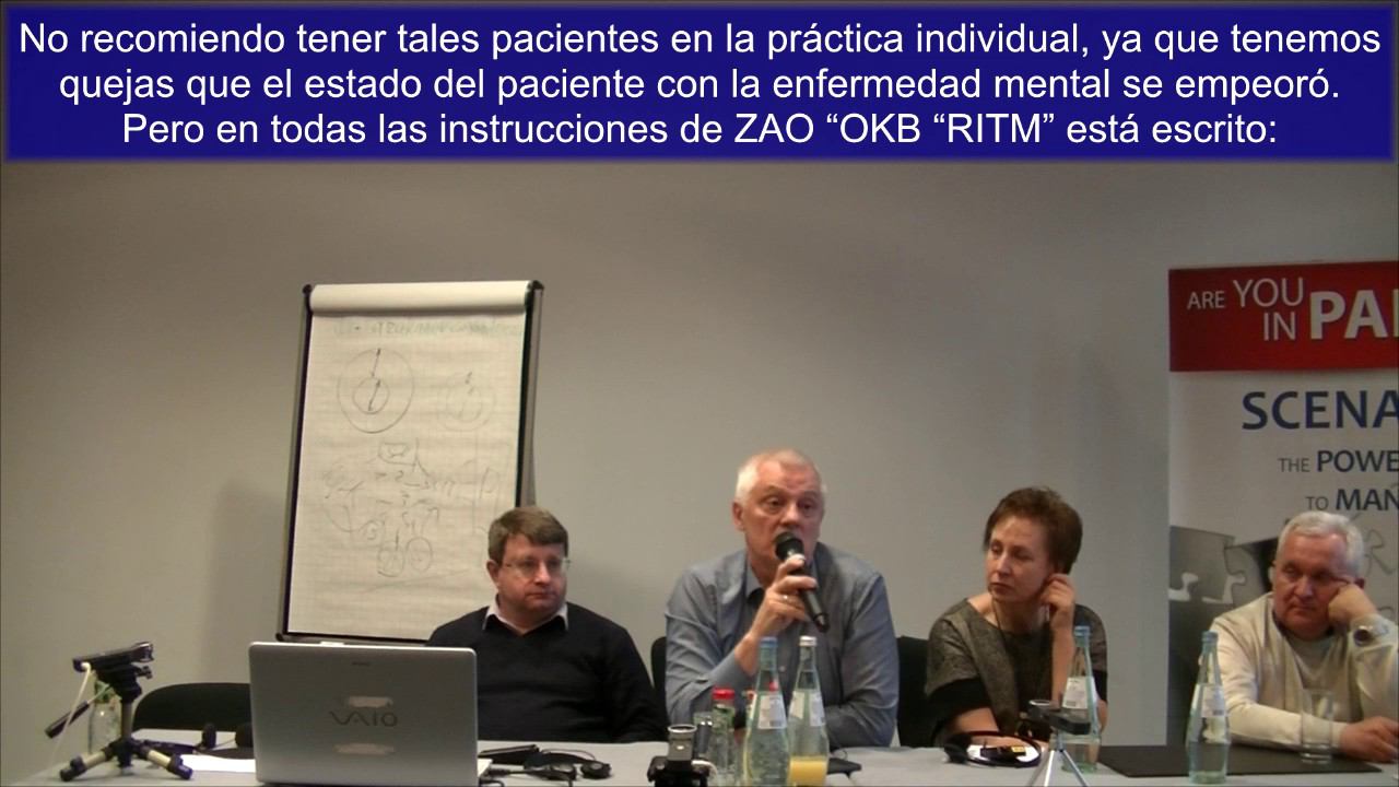 Una de las contraidicaciones para el uso de SCENAR es prenecia de enfermedades mentales. ¿Si Ud recomienda empezar el trabajo con el paciente que tiene trastorno bipolar? En el caso de psicosis maníaco-depresiva y otros trastornos mentales podemos empezar el trabajo si el paciente está en el hospital psiquiátrico y le tienen bajo observación de los psiquiatras, si el paciente tiene enfermedades somáticas que no se curan con otros métodos. No pretendemos curar enfermedades mentales, sino pretendemos curar enfermedades somáticas de este paciente. No recomiendo tener tales pacientes en la práctica individual, ya que tenemos quejas que el estado del paciente con la enfermedad mental se empeoró. Pero en todas las instrucciones de ZAO “OKB “RITM” está escrito: ¡no usar SCENAR con la presencia de la desviación mental de paciente! Por eso si el médico asumió la responsabilidad, pues es su responsabilidad personal. Claro, para el futuro, si los psiquiatros van a investigarlo, tendremos resultados interesantes. ¿Pero cuándo será esto?