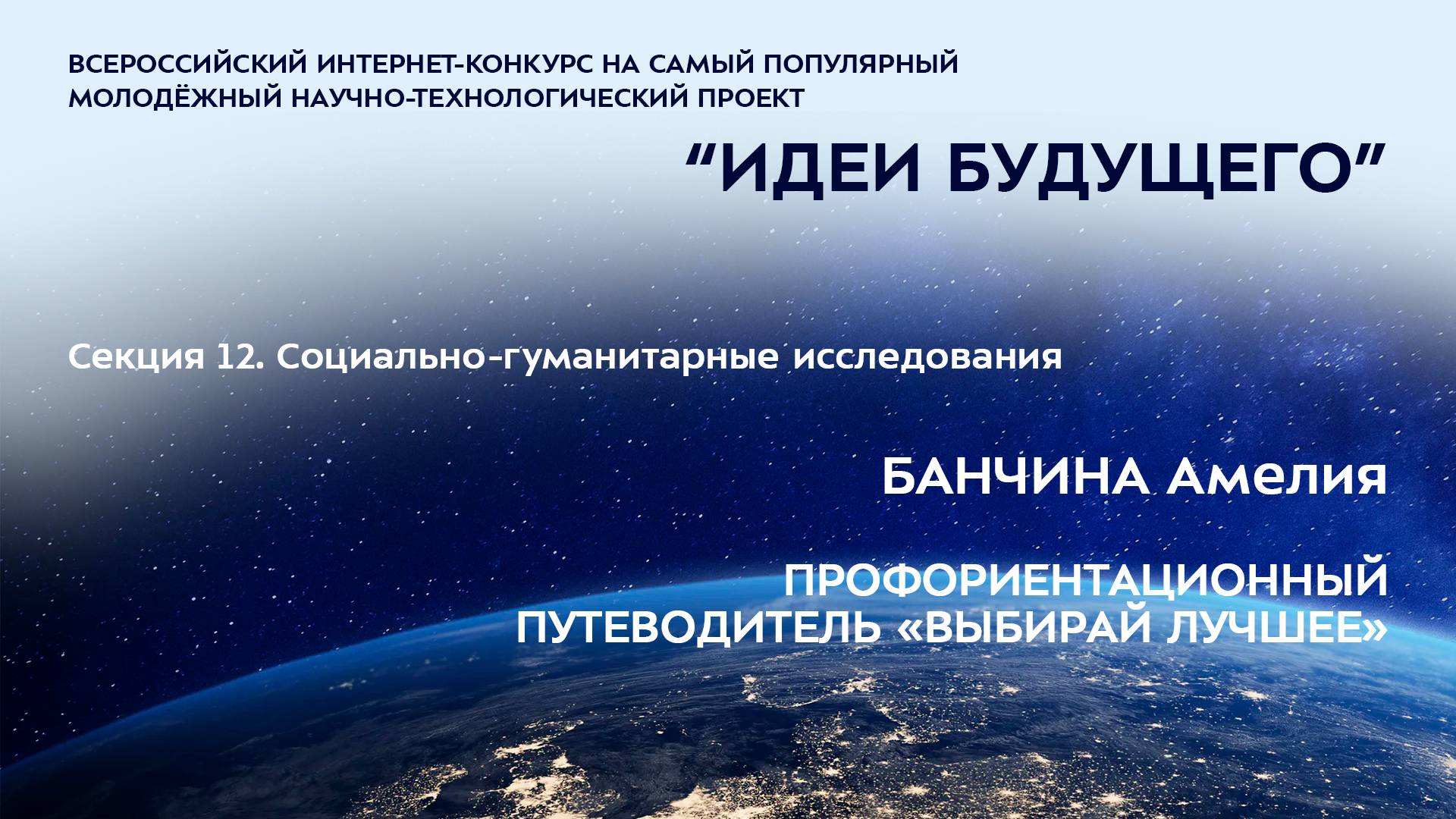 (12-8) БАНЧИНА Амелия Алексеевна Республика Саха (Якутия), с. Майя МБОУ «Майинский лицей им. И.Г. Тимофеева», 8 класс ПРОФОРИЕНТАЦИОННЫЙ ПУТЕВОДИТЕЛЬ «ВЫБИРАЙ ЛУЧШЕЕ» Научный руководитель: Решетникова Зинаида Валерьевна, Республика Саха (Якутия), с. Майя, МБОУ «Майинский лицей им. И.Г. Тимофеева», учитель информатики Более подробно о мероприятиях Программы "Шаг в будущее" можно узнать на сайтах http://www.step-into-the-future.ru/ и http://шагвбудущее.рф Мероприятия проводятся при поддержке Фонда президентских грантов