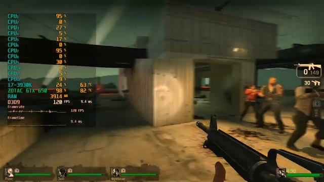 Game: Left 4 Dead Сomputer characteristics: Socket: LGA 2011 Motherboard: Asus Sabertooth X79 Processor: i7 3930K 3.20GHZ RAM: HYPER X 16GB DDR3-DIMM 1600 GPU: ZOTAC GTX 650 GDDR5 2GB ROM: SSD 128GB+HDD 500GB Video in 1920x1080 resolution. Operating system: Windows 10 Pro