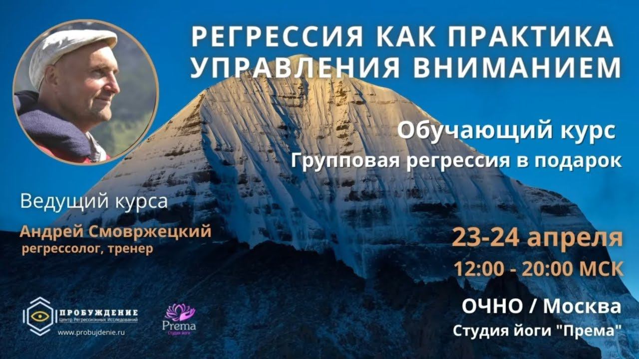 Обучающий курс Андрея Смовржецкого - РЕГРЕССИЯ КАК ПРАКТИКА УПРАВЛЕНИЯ ВНИМАНИЕМ Познание практических техник работы регрессолога для самосовершенствования себя и для работы с другими людьми Запись на очное обучение на сайте центра "Пробуждение" https://probujdenie.ru/regressii-andrei-smovrzheckii/