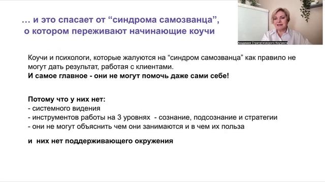 Устраните три причины и вы станете востребованным специалистом в области услуг. Мастером своего дела, который уверенно ведет клиентов к результату. Третья причина синдрома самозванца - не могут объяснить чем они занимаются и в чем их польза? Обучаем Стратегическому коучингу и выдаем - Удостоверение повышения квалификации - Диплом о проф. переподготовке (Образовательная Лицензия № Л035-01271-78/01043140) Школа Стратегического коучинга https://procoachedu.ru/school Проект в соцсетях: Вконтакте - https://vk.com/irinaleadercoach телеграм - https://t.me/irinaleadercoach #коучинг #стратегический_коучинг #обучение_коучингу #синдром_самозванца