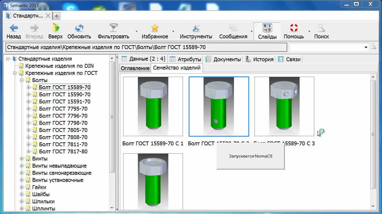 Показана интеграция между электронной системой управления нормативно-технической документацией (НТД) NormaCS и системой управления нормативно-справочной информацией (НСИ) Semantic, предназначенной для классификации материально-технических объектов и структурированного описания их характеристик. Обратная интеграция позволяет по обозначению стандартов из NormaCS находить соответствующие справочные объекты в Semantic. Если таким объектом является гостированный инструмент, оснастка или стандартное изделие, то Semantic предоставит доступ к типоразмерам этого объекта и в случае необходимости визуализирует его 3D-модель.