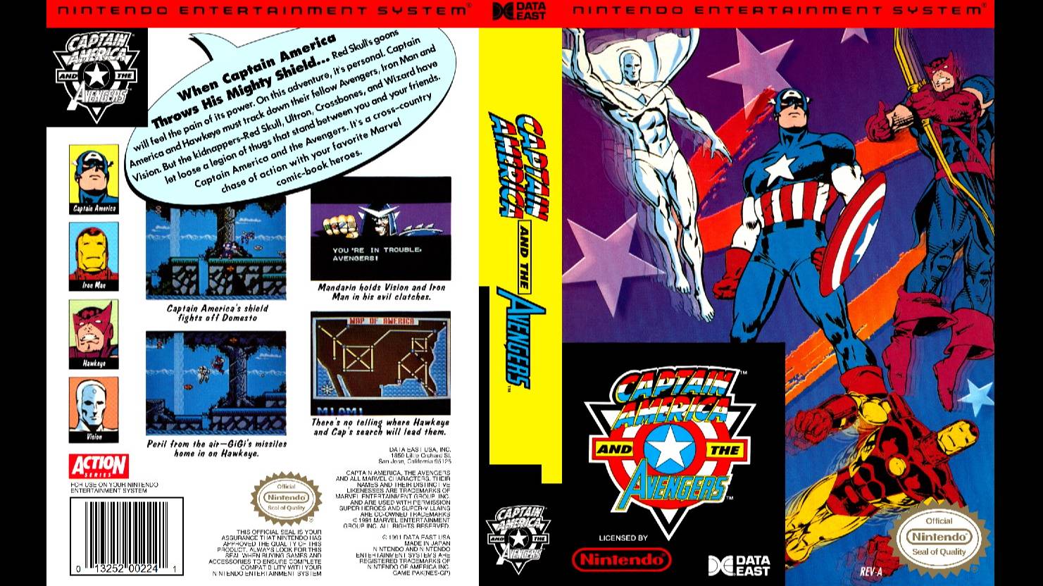"CAPTAIN AMERICA AND THE AVENGERS" (КАПИТАН АМЕРИКА И МСТИТЕЛИ) - компьютерная игра в жанре beat ’em up, разработанная и выпущенная японской компанией DATA EAST в 1991 году для NES, представляет собой классический платформер с боковой прокруткой. Как и в случае с портом для SEGA, в самой Японии не выходила. Игра о приключениях супергероев команды Мстителей из комиксов MARVEL. Игровыми персонажами в этой игре стали Капитан Америка и Соколиный Глаз. Их миссия - спасти андроида Вижена и Железного Человека, которых заманил в своё логово коварный Мандарина, а затем победить Красного Черепа. Оба супергероя перемещаются по городам Америки, их путь виден на карте. Кэп использует против врагов свой мощный метательный щит, Соколиный Глаз разит захватчиков чуть менее мощными стрелами. У каждого героя свои преимущества: у Капитана спецприемы, лучник достает врагов стрелами там, где не дотянется Кэп. Поначалу персонажи не слишком могучи, но их можно прокачивать, собирая по пути кристаллы силы. Несмотря на некое однообразие и повторы в плане графики, дизайна уровней, музыки и врагов, игра всё-таки вызывает к себе интерес. Есть режим "battle mode" где можно подраться с боссами, а управлять ими будет второй игрок.