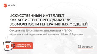 15 и 16 февраля прошла XII Всероссийская научно-методическая конференция «Современная дидактика и качество образования: от инновации к традиции». Мы хотим предложить окунуться в эту активную и насыщенную атмосферу! Как приятное послевкусие, предлагаем вашему вниманию инновационные практики, представленные в рамках конференции. Тема: «Возможности и практика использования сервисов на основе ИИ для конструирования и реализации ИОМ». Мастер-класс «Искусственный интеллект как ассистент преподавателя: возможности генеративных моделей». Ведущий: - Окладникова Татьяна Васильевна - методист КГБПОУ «Красноярский педагогический колледж № 1 им. М. Горького».