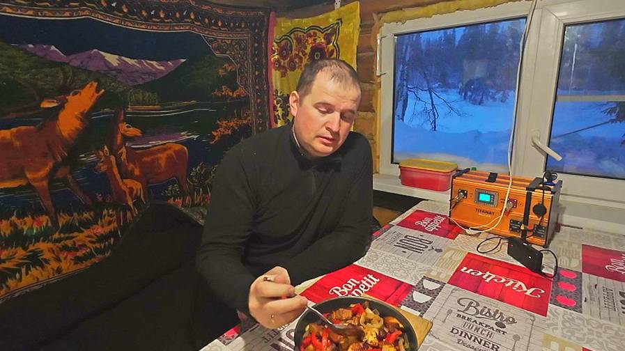 День в тайге. Изба приютила от непогоды. Рыбалка в глухозимье. Готовлю обед в казане.