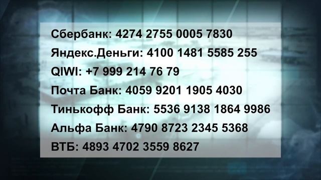 АКТУАЛЬНЫЕ РЕКВИЗИТЫ: • Сбербанк 4274 2755 0005 7830 • Тинькофф Банк 5536 9138 1864 9986 • ВТБ 4893 4702 3559 8627 • Альфа Банк 4790 8723 2345 5368 • Почта Банк 4059 9201 1905 4030 • ЮMoney (Яндекс.Деньги) 4100 1481 5585 255 • QIWI +7 999 214 76 79 • WebMoney P889325720472