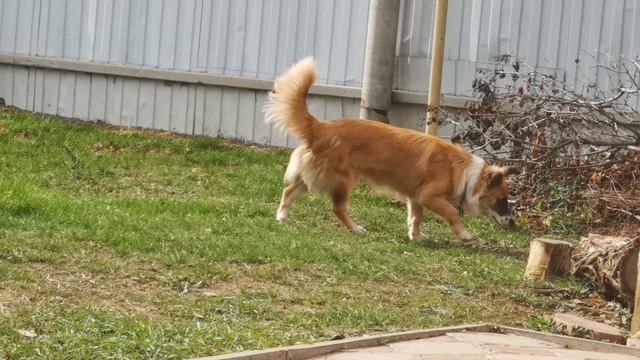 Пёс играется во дворе