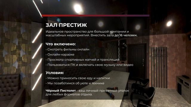 Зал «Престиж»- уютная комната для компании до 16 человек. Идеальное пространство для большой и шумной компании. "Престиж" создан для масштабных мероприятий, где важны не только отличная музыка, но и простор, и особая праздничная атмосфера. С понедельника по четверг с 12:00-00:00 До 16 человек 1200₽/час С понедельника по четверг с 00:00-06:00 До 12 человек- 1500 руб/час До 16 человек- 1800 руб/час Выходные и праздничные дни: до 12 человек 1500 руб./час - стоимость указана с компании! до 16 человек 1800 руб./час - стоимость указана с компании! За каждого последующего человека доплата в размере 150₽/час независимо выходной, праздничный или обычный день! Зал «Престиж»— комната с большим экраном, диагональю 2.5 метра.! С возможностью: — смотреть прямые трансляции спортивных матчей; — смотреть фильмы онлайн; — петь караоке (два микрофона 🎤) — играть в настольные игры («Нарды», карты, «Монополия», «Мафия», «Иманджинариум», «Покер», «Игры полов», «Уно», «Скажи иначе», «Дженга», «Табу»,«Игра в ассоциации»,«Ответь за 5 секунд»,«Игра с мемами»,«Фанты», «Домино», «Чпок», «Бункер», «Кто я?»). — пользоваться ПК (что дает вам возможность зайти в любую соц. сеть и включать свою музыку и также любое видео) В зале присутствует кондиционер и вентиляция. Пробковый сбор не взимается! 🎁 Бонус именинникам: скидка 7% при бронировании зала от 3 часов