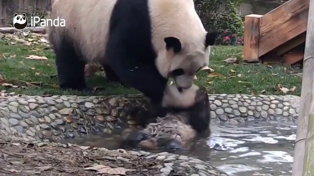 Мама-панда пытается искупать детеныша