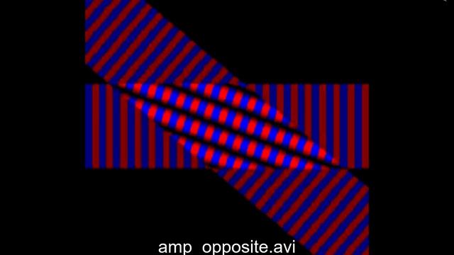 Electric field in time from two plane wave interference. Red is positive electric field amplitude and blue is negative electric field amplitude. The two waves have the same wavelength and are traveling in nearly opposite directions. Nodes (destructive interference) and anti-nodes (constructive interference) are clearly observed as lines in the overlap area.