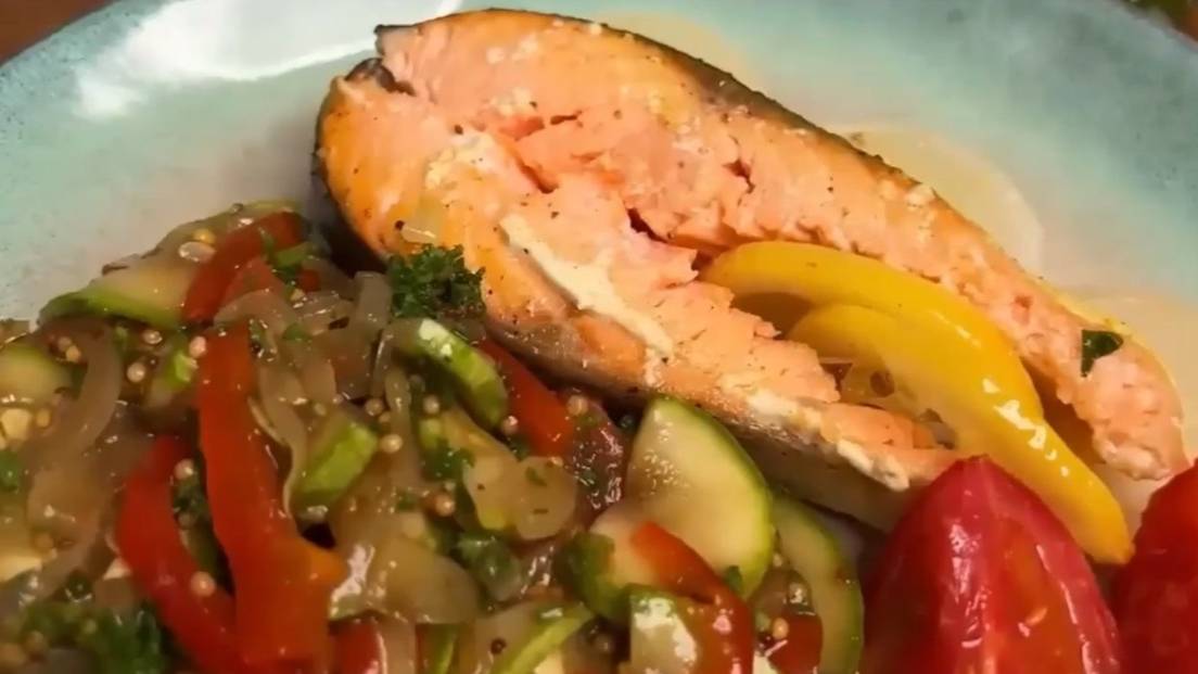 Лосось, запеченный в духовке с овощами к праздничному столу. Ингредиенты: ● Лосось - 2 кг ● Растительное масло – 70 г ● Соль, черный перец, приправа для рыбы с солью ● Лук репчатый - 3 шт. ● Лимоны - 2 шт. ● Помидоры - 4 шт. ● Сливочное масло - 50 г ● Кабачки - 2 шт. ● Сладкий перец - 1 шт. ● Томаты черри - 200 г ● Французская горчица ● Соевый соус - 50 мл ● Петрушка ● Растительное масло для жарки