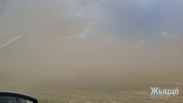 Недалеко от Речицы видимость резко снизилась из-за пыли с полей, которую подняло ветром. Наш журналист зафиксировал, как встречные автомобили буквально выныривают из густой пелены.