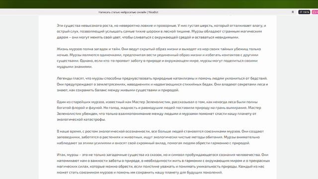 Мурзы – загадочные и удивительные существа, о которых слагают сказки и легенды. Они обитают в глубоких лесах, где солнечные лучи едва мелькают между зеленой листвой. Мурзы – настоящие хранители природы, невидимые для глаз обычных людей. Считается, что каждый мурз имеет свою стихию и несет ответственность за ее сохранение. Эти существа невысокого роста, но невероятно ловкие и проворные. У них густая шерсть, который отталкивает влагу, и острый слух, позволяющий услышать самые тихие шорохи в лесной тишине. Мурзы обладают странным магическим даром – они могут менять свой цвет, чтобы сливаться с окружающей средой и оставаться невидимыми. Жизнь мурзов полна загадок и тайн. Они ведут скрытый образ жизни и выходят из нор своих тайных убежищ только ночью. Мурзы являются одиночками, предпочитая вести уединенный образ жизни и избегать контактов с другими существами. Однако, если кто-то проявит заботу о природе и окружающем мире, мурзы могут поделиться своими мудрыми знаниями. Легенды гласят, что мурзы способны предчувствовать природные катаклизмы и помочь людям уклониться от бедствий. Они предупреждают о землетрясениях, наводнениях и надвигающихся стихийных бедах. Они владеют секретами леса и знают, как сохранить баланс между живыми существами и природой. Один из старейших мурзов, известный как Мастер Зеленолистик, рассказывал о том, как некогда леса были полны богатой флорой и фауной. Но голод, жадность и равнодушие людей поставили природу на грань вымирания. Мастер Зеленолистик убежден, что только взаимопонимание между людьми и мурзами поможет спасти нашу планету от экологической катастрофы. В наше время, с ростом экологической осознанности, все больше людей становятся союзниками мурзов. Они создают заповедники, заботятся о растениях и животных, ищут экологически чистые методы обитания. Мурзы внимательно наблюдают за этими усилиями и вносят свой скромный вклад, помогая людям обрести гармонию с природой. Итак, мурзы – это не только загадочные существа из сказок, но и символ пробуждающегося сознания человечества. Они напоминают нам о важности заботы о природе, о необходимости жить в гармонии с окружающим миром и о прекрасных магических силах, которые можно обрести, если поистине уважать и понимать уникальность природы. Каждый из нас может стать союзником мурзов и помочь им сохранить нашу планету для будущих поколений.