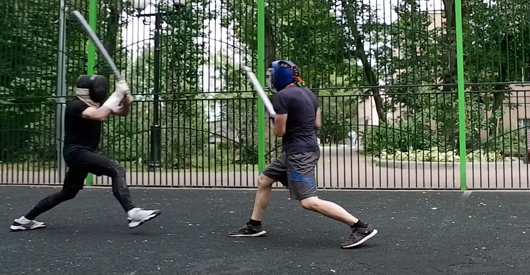 Урок фехтования катаной обучение кендзюцу - спарринг на длинных мечах летом на спортивной площадке