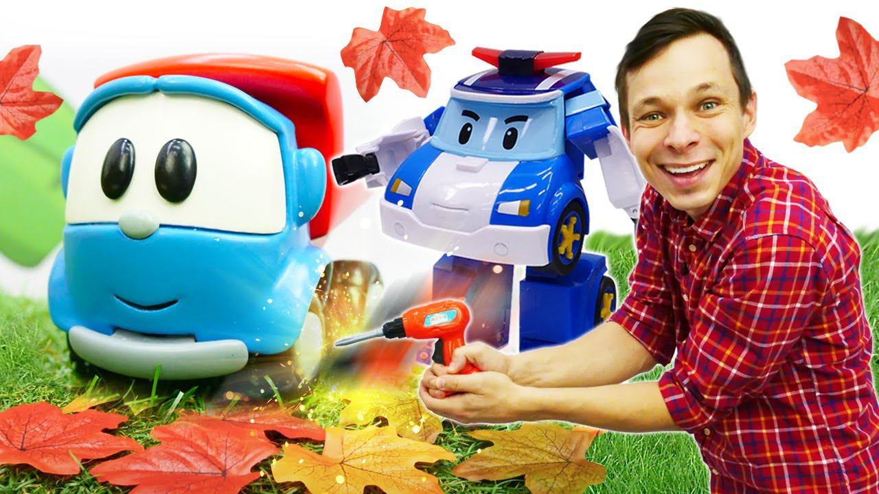Детские мультики про машинки. Грузовичок Лева и Робокар Поли собирают листья! Видео с игрушками