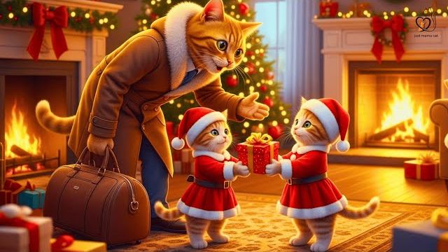 Рыжий котенок продает пончики в качестве рождественского подарка для папы