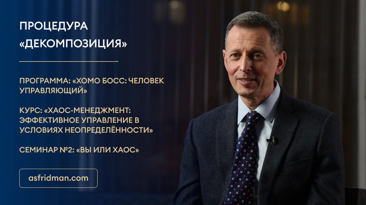 Процедура «Декомпозиция» Программа: «Хомо Босс: Человек Управляющий» Курс: «Хаос-Менеджмент: Эффективное управление в условиях неопределённости» Семинар №2: «Вы или ХАОС» Расписание открытых семинаров Александра Фридмана: https://www.asfridman.com/raspisanie/