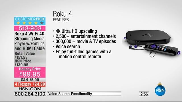 For More Info or to Buy Now: http://www.hsn.com/products/seo/8240839?rdr=1&sourceid=youtube&cm_mmc=Social-_-Youtube-_-ProductVideo-_-513903 Roku 4 WiFi 4K Streaming Media Player with MotionControlled Remote with Voice Search and CinemaNow Movie Rental Offer Get your favorite TV shows, movies, sports and streaming music, all at your... Prices shown on the previously recorded video may not represent the current price. View hsn.com to view the current selling price. HSN Item #513903