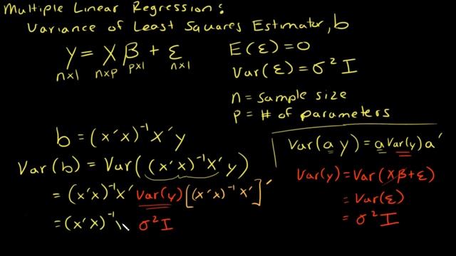 Show the Proof. In this video I show the math behind deriving the variance for the Least Squares Estimator, b, for the Multiple Linear Regression Model using matrix notation.