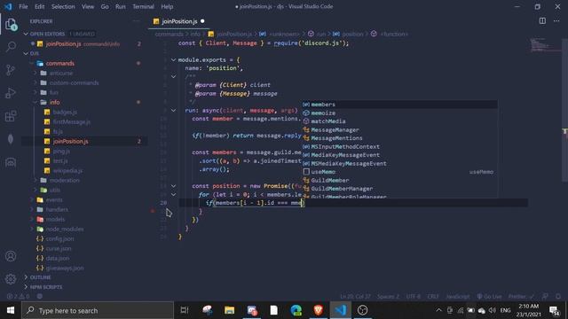 Links -- discord: https://discord.io/reconlx github: https://github.com/reconlx source: https://github.com/reconlx/discord.js-tutorials/tree/%2344-Join-Position-Command-(members)