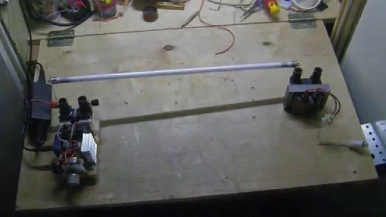 Всё сделано по патенту Тесла №593138 "Электрический трансформатор", но на современной элементной базе. В качестве передатчика качер Бровина на катушке зажигания без сердечника, в качестве приёмника - катушка зажигания с сердечником и лампочка от фонарика в качестве нагрузки. Ничего не заземлено, т.е. используется ТОЛЬКО один провод. Напряжение питания 24 вольта, нагрузка - лампочка 13,5 вольт 0,16 ампер.