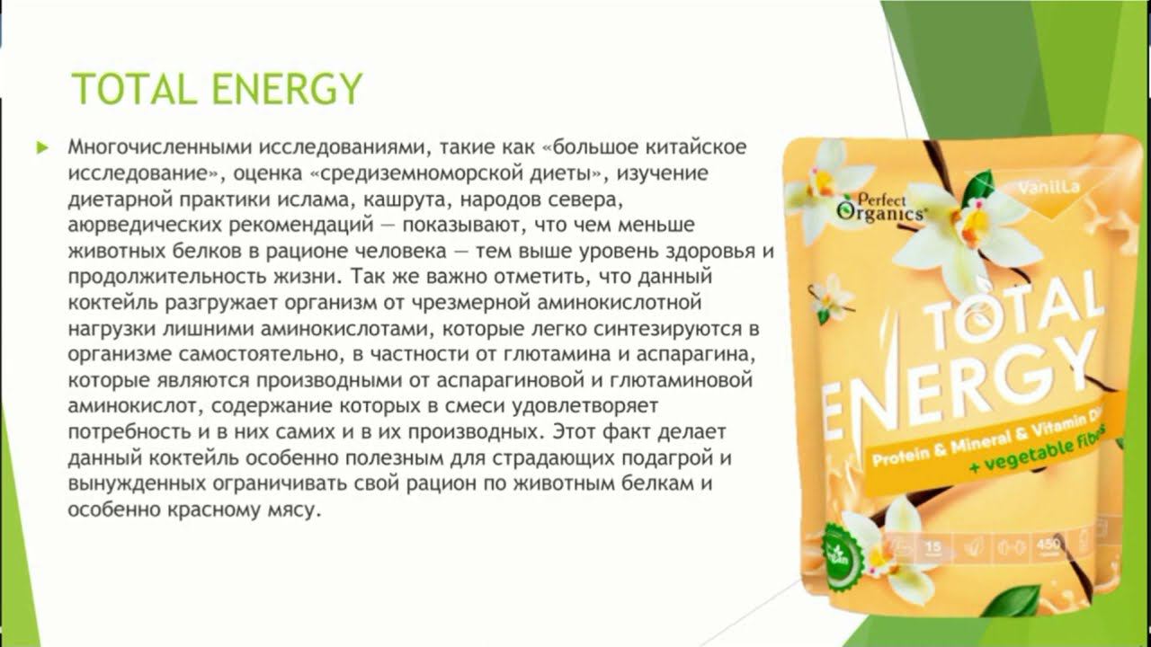 TOTAL ENERGY — это полноценный, вегетарианский низкокалорийный заменитель пищи, без искусственных красителей и вкусоароматических добавок, содержащий исключительно натуральные компоненты. Коктейль "Тотал Энерджи" со вкусом абрикоса — концентрат сухой белковый (протеиновый), 450 г Смесь сухая для приготовления коктейлей КУПИТЬ: https://orgmlm.ru/referal-cart/view-get-link.html?link=MTIwNwMTc3NTE0MzI2MQ Коктейль "Тотал Энерджи" со вкусом кофе — концентрат сухой белковый (протеиновый), 450 г Смесь сухая для приготовления коктейлей КУПИТЬ: https://orgmlm.ru/referal-cart/view-get-link.html?link=MTIwOAMTc3NTE0MzI2NA Функциональность состава определяется сбалансированным сочетанием всех незаменимых, условно заменимых и заменимых аминокислот растительных протеинов сои и гороха, дополненных протеинами овса, полноценному минеральному составу красной арктической водоросли, витаминной смеси и шикарному набору нерастворимых и растворимых пищевых волокон. Хорошее усвоение растительных протеинов поддерживается источником фруктовых ферментов — экстрактом папаи. Многочисленными исследованиями, такие как «большое китайское исследование», оценка «средиземноморской диеты», изучение диетарной практики ислама, кашрута, народов севера, аюрведических рекомендаций — показывают, что чем меньше животных белков в рационе человека — тем выше уровень здоровья и продолжительность жизни. Так же важно отметить, что данный коктейль разгружает организм от чрезмерной аминокислотной нагрузки лишними аминокислотами, которые легко синтезируются в организме самостоятельно, в частности от глютамина и аспарагина, которые являются производными от аспарагиновой и глютаминовой аминокислот, содержание которых в смеси удовлетворяет потребность и в них самих и в их производных. Этот факт делает данный коктейль особенно полезным для страдающих подагрой и вынужденных ограничивать свой рацион по животным белкам и особенно красному мясу. TOTAL ENERGY — это физиологически обоснованное и сбалансированное питание, которое наполнит Вас энергией и незаменимыми веществами. Это оптимальное решение в условиях напряженного графика и дефицита времени. С широкой линейкой вкусов TOTAL ENERGY Вы легко будете контролировать свой вес и избегать переедания. Старайтесь использовать чистую воду, а не молоко или кефир — это позволит сохранить минимальный уровень калорий в порции, а именно 62 ккал за один прием коктейля TOTAL ENERGY. Возможна индивидуальная непереносимость компонентов продукта. ПОКАЗАНИЯ: ▶️ замена традиционного приема пищи (завтрака, обеда или ужина) при диетах, направленных на достижение нормального индекса массы тела (BMI); ▶️ потребность в восполнении дефицита кальция и профилактике остеопороза; ▶️ при недостаточности микроэлементного состава традиционного рациона (при микроэлементозах); ▶️ как дополнительный к традиционному питанию сбалансированный источник нутриентов (витаминов, минералов, пищевых волокон, антиоксидантов) для лиц с недостаточной массой тела; ▶️ в качестве пребиотического средства для восстановления баланса кишечной микрофлоры, профилактики дисбактериоза; ▶️ для нормализации стула; ▶️ для спортсменов-вегетарианцев, а также спортсменов, отказывающихся от животных белков и смесей на их основе в период религиозных постов. Пищевая ценность (среднее значение в 30г): белки — 11г, жиры — 0,5г, углеводы — 2г, 