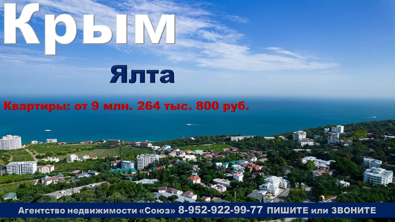 Подпишитесь на нас. Благодарим !!! https://www.youtube.com/@nedvigimoct/videos - мы на Ютубе https://dzen.ru/nedvigimoct?tab=longs&utm_referrer=dzen.ru - мы на Дзене https://rutube.ru/channel/27083000/videos/ - мы на Рутубе https://vk.com/club223108371 - мы в ВК https://ok.ru/lyubayan Агентство недвижимости «СОЮЗ» Покупайте: квартиру в Крыму. г.Ялта, пгт Виноградное, ул. Объездная дорога, Агент по новостройкам: 89529229977 Цены на квартиры точно такие же как и у застройщика. Квартиры продаются БЕЗ РИЭЛТОРСКОЙ КОМИССИИ !!!. Ст. квартиры: от 9 млн. 264 тыс. 800 руб. Ежемесячный платеж: 44 382 руб. при ставке 6% Площадь общая: 25,04 м2 - 38,05 м2 1к. квартиры: от 15 млн. 140 тыс. 100 руб. Ежемесячный платеж: 72 527 руб. при ставке 6% Площадь общая: 46,3 м2 - 60,85 м2 2к. квартиры: от 16 млн. 618 тыс. 420 руб. Ежемесячный платеж: 79 609 руб. при ставке 6% Площадь общая: 51,61 м2 - 91,72 м2 3к. квартиры: от 22 млн. 022 тыс. 820 руб. Ежемесячный платеж: 105 498 руб. при ставке 6% Площадь общая: 71,97 м2 - 92,93 м2 Срок сдачи: 1 кв. 2026 Срок выдачи ключей: 4 кв. 2026 Договор: ДДУ Тип дома: кирпично-монолитный Тип отделки: подготовка под чистовую отделку Парковка: подземная Потолки: 3,2 м. Преимущества:Доверительное управление. Транспортная доступность. Большой выбор планировочных решений. Круглосуточный консьерж-сервис. Подземный паркинг. Рекреационный бассейн с подогревом. Система "Умный дом". Описание комплекса:Жилой комплекс — это сочетание современной архитектуры, редких форматов планировочных решений с курортным набором премиальных опций и уникального внутреннего пространства, где в повседневную жизнь владельцев интегрирован здоровый образ жизни, комплексное развитие и спорт, вне зависимости от возраста и сферы деятельности. Это ЖК на южном берегу Крыма на территории Большой Ялты, в непосредственной близости от Ливадии. Он расположен на возвышенности у границы Ялтинского горно-лесного заповедника. Из квартир комплекса открываются завораживающие виды на горный массив и Черное море. Архитектурная концепция комплекса выполнена в стиле современного минимализма. Строгие вертикальные линии фасада и элегантные архитектурные белоснежные пояса, обрамляющие жилые башни комплекса, балюстрады из закаленного стекла и ночная контурная подсветка придают футуристичный облик всему архитектурному ансамблю и заявляют о новом стиле жизни Ливадии. Фасады башен – это 80% панорамного остекления и 20% панелей вентилируемого фасада в теплых натуральных цветах дерева. Панорамные террасы, открытые балконы, зеленые патио, дополняют единую композицию, поддерживая уникальный стиль комплекса. Архитектура и планировочные решения представлены уникальными форматами квартир с редким набором площадей и опций, чтобы все ваши мечты о доме сбылись. Большая линейка планировочных решений площадью от 25 до 460 кв.м. Из всех квартир открываются потрясающие виды на море и горные массивы. Эксклюзивные квартиры с большими террасами и обзором панорамы на 260 градусов. Хайфлеты с патио и индивидуальным входом. Большие семейные квартиры с примыканием квартир для размещения гостей и помощников. Пентхаусы с террасами и личным выходом на эксплуатируемую кровлю. Квартиры с мастер-спальнями имеют отдельную гардеробную и ванную комнату, таким образом и утро, и ночь будет начинаться плавно, без выхода из комфортной зоны. В каждой квартире панорамные окна, видовая открытая лоджия, на которой можно организовать летнюю веранду. В наличии лоты с мастер-спальня