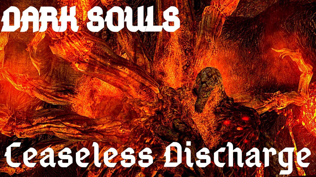 Ceaseless Discharge, also known as the Molten Giant, is a boss in Dark Souls, located in the Demon Ruins. He is the only son of the Witch of Izalith, one of the four original Lords and creator of the Flame of Chaos. Ceaseless Discharge was born as the youngest child and only son of the Witch of Izalith. However, his existence was not without hardship as he was born with sores inflamed by lava. His sisters gave him the Orange Charred Ring, presumably to ease his pain. Ceaseless was unfortunately clumsy and dropped the ring, which later lead to the birth of the terrible Centipede Demon at the spot where it fell. When the Witch of Izalith attempted to duplicate the First Flame using a Lord Soul, the Flame of Chaos was created instead. Ceaseless was transformed into a gigantic beast of terrifying size by the unstable flame, and was thereby regarded as the first demon. Many of his sisters suffered similarly horrible fates and his mother was warped into the Bed of Chaos, the source of all subsequent demons that were created after their family. Ceaseless came to inhabit the Demon Ruins and watched over the corpse of one of his sisters, who was laid to rest alongside her Gold-Hemmed Black Set. His only source of comfort was the belief that those sisters that still resided in the fallen city of Lost Izalith watched over him.